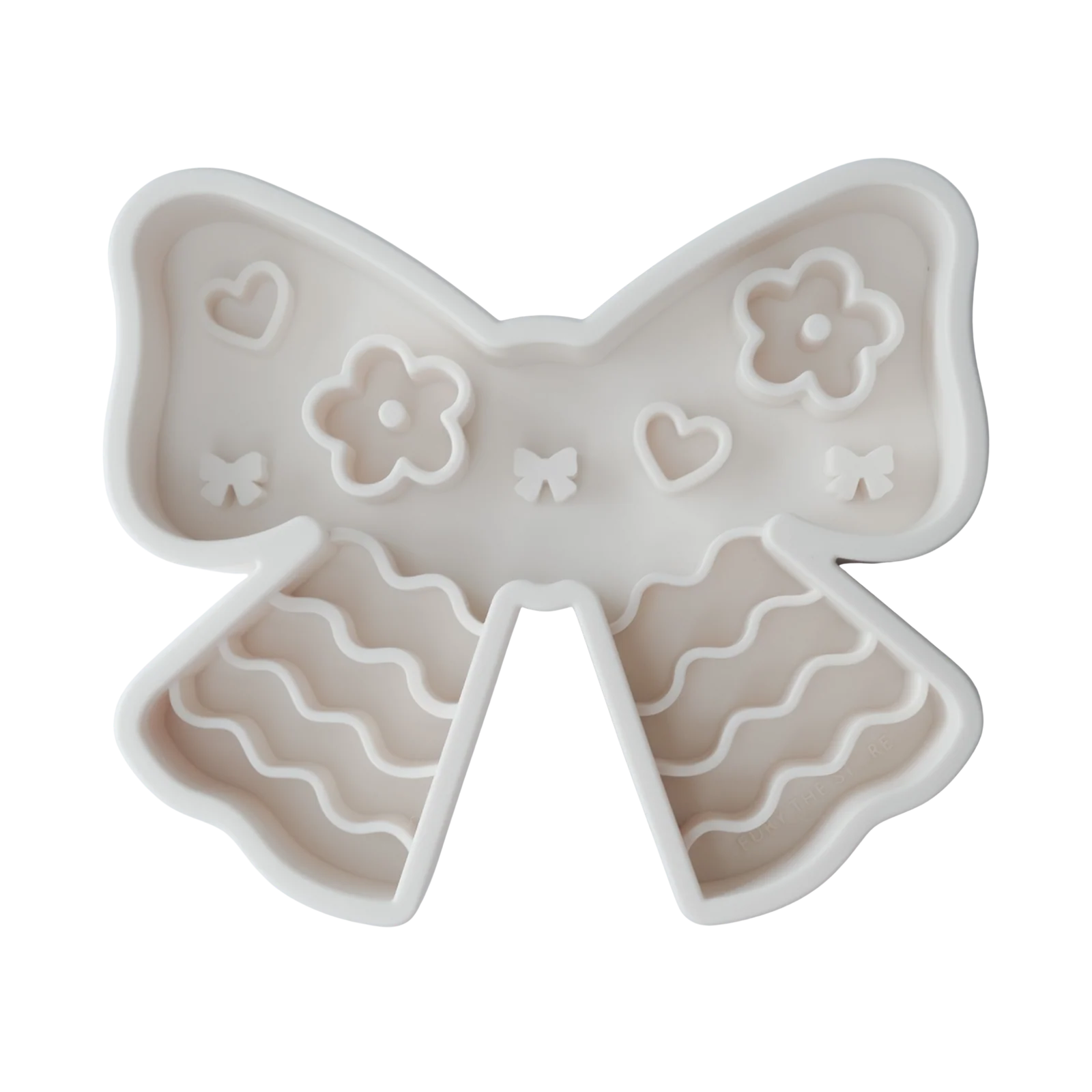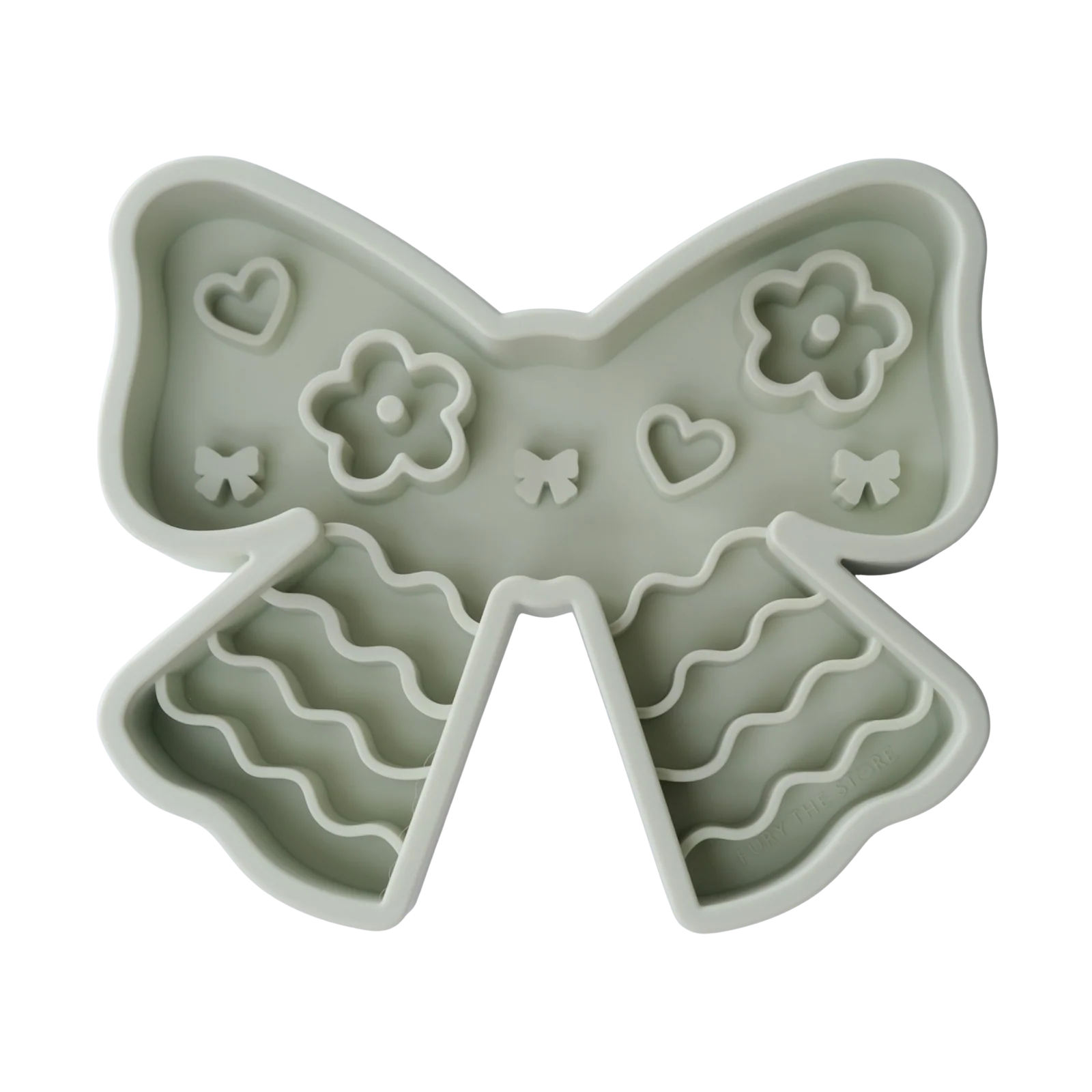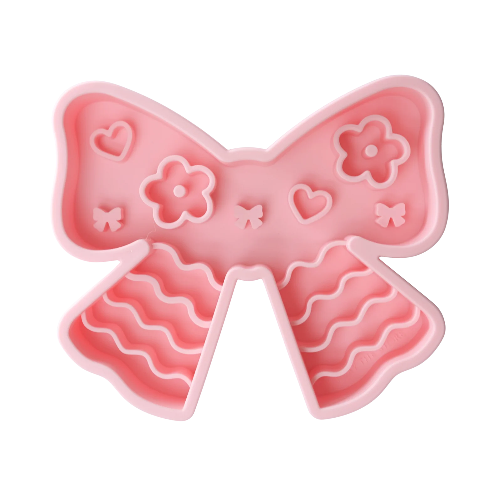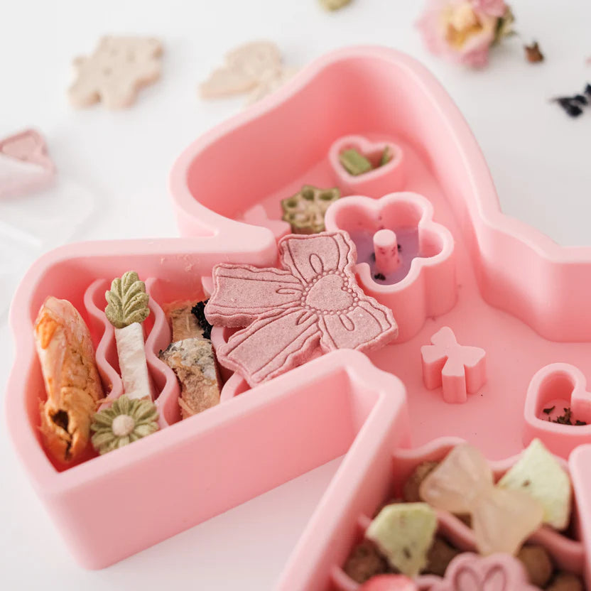 After much consideration I landed on a bow shape, to encourage her to move around the forage feeder with her snout guiding her to reach the different crevices. The top half of the feeder feature hearts and flowers in various heights and sizes for placing high value ingredients. Three solid bows were added to provide some separation in the main area of the slow feeder. Lastly, the bottom wave sections are suitable for placing freeze dried food, kibble, raw meat, bone broth or whatever your dog’s main meal is!
