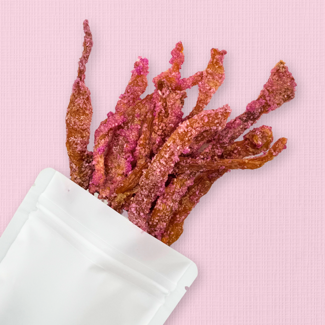 Shimmering with natural goodness, our Crystal Sticks are crafted from premium Australian chicken breast with a tropical blend of pink pitaya and coconut. Light, crunchy and full of flavour, these jerky-style sticks are freeze-dried to perfection—making them a nourishing treat that looks as magical as it tastes.