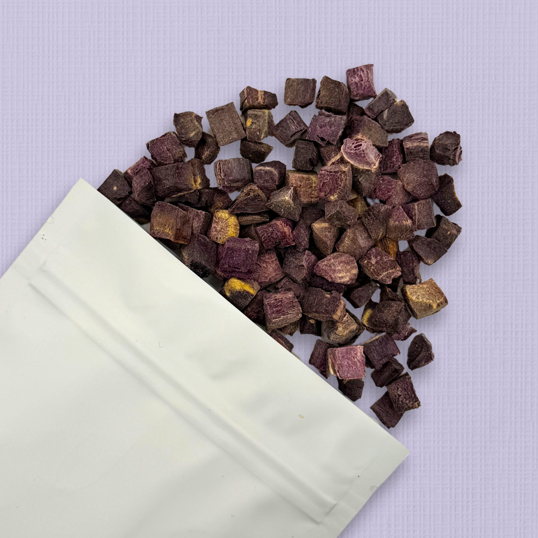 Bright, bite-sized, and naturally nutritious – our Freeze-Dried Purple Carrot Cubes are made from 100% Australian-grown purple carrots with no additives or preservatives. Carefully freeze dried to lock in their vibrant colour, flavour, and nutrients, these superfood snacks are perfect for both cats and dogs.